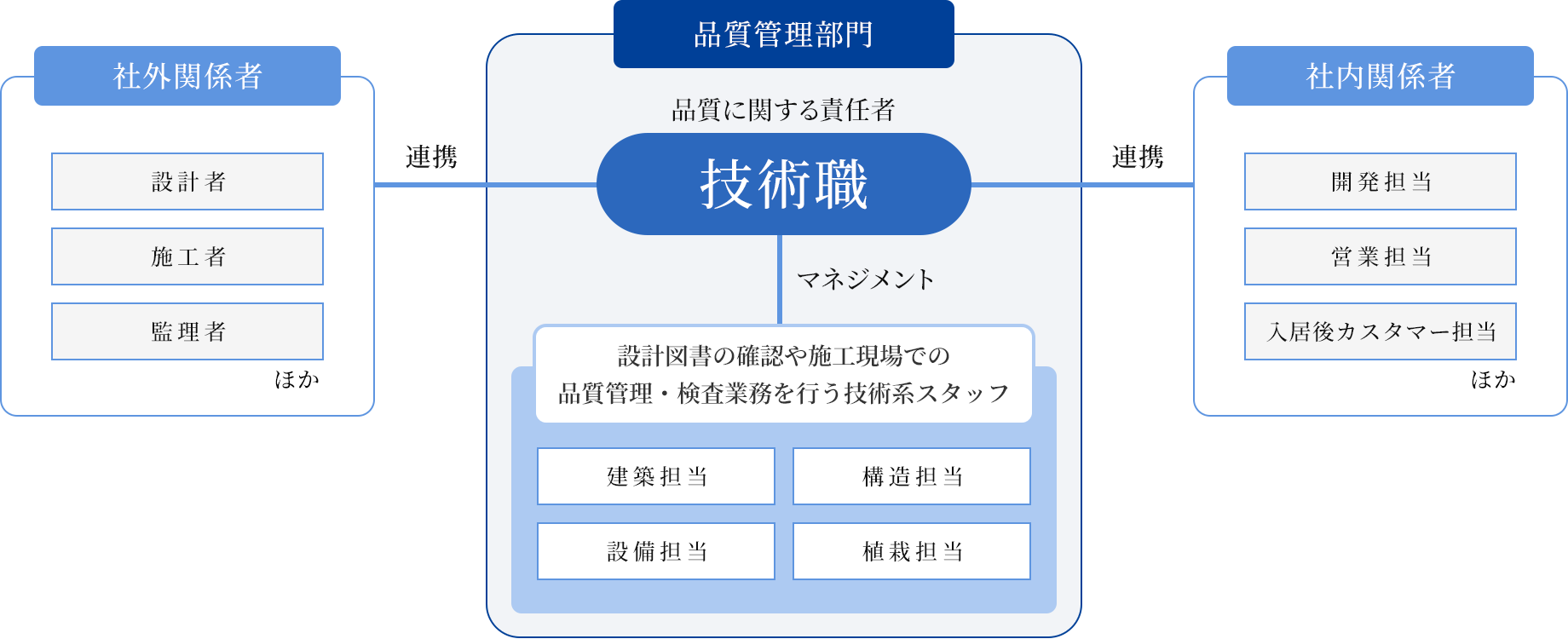 三井不動産レジデンシャルの「すまい」づくりは、プロジェクト(物件)単位で行われます。プロジェクトには、開発・営業・品質管理などの社内部門に加え、多様な社外パートナーが関わります。その中で、これらの関係者と連携しながら、プロジェクトの「品質に関する責任者」として事業を推進するのが技術職の役割です。