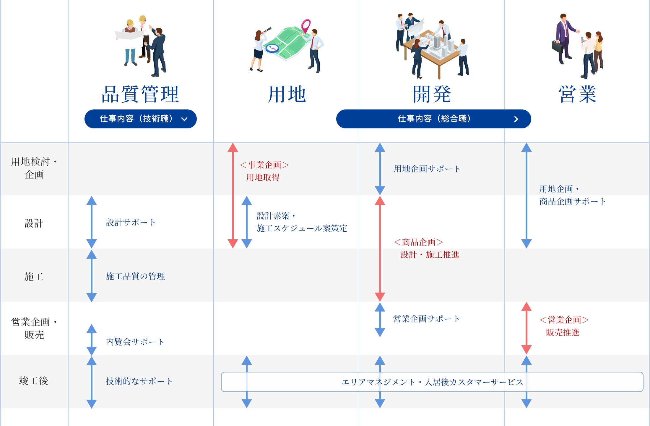 前職で培った専門領域での知識や経験を活かし、物件の品質に関する責任者として事業を推進する技術職の各業務を紹介します。