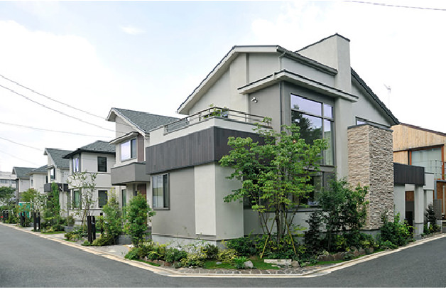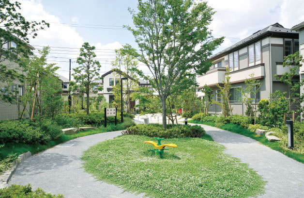 かつての市民グラウンドが、開発道路を中心に全35邸が建ち並ぶ戸建住宅街として生まれ変わりました。人々が集い、街のシンボルとなる公園を新しく街区内に設けることで、温かな地域コミュニティが育っています。アースカラーを基調にした外観には温かみのある素材を組み合わせ、木々の緑とともに美しさが深まる景観を形成。全邸で敷地面積110㎡超のゆとりをもった敷地に芝生の庭や植栽を施し、武蔵野の緑と調和しつつ快適な動線や安全性も実現しています。